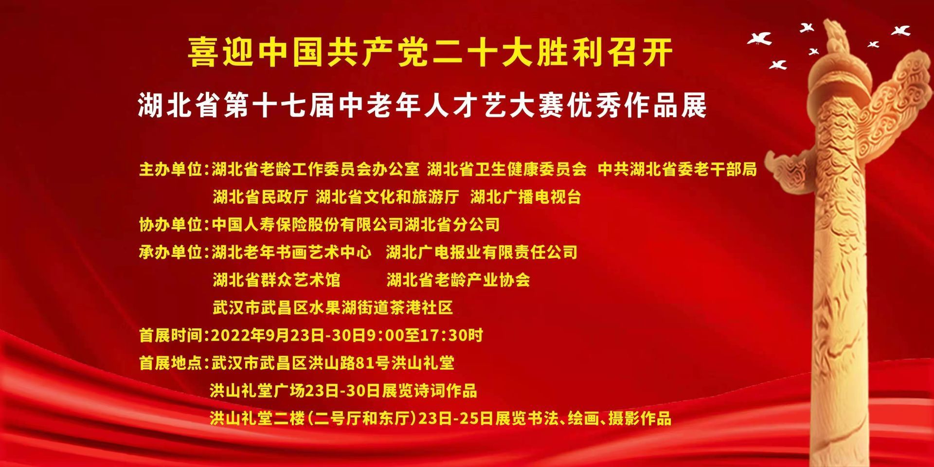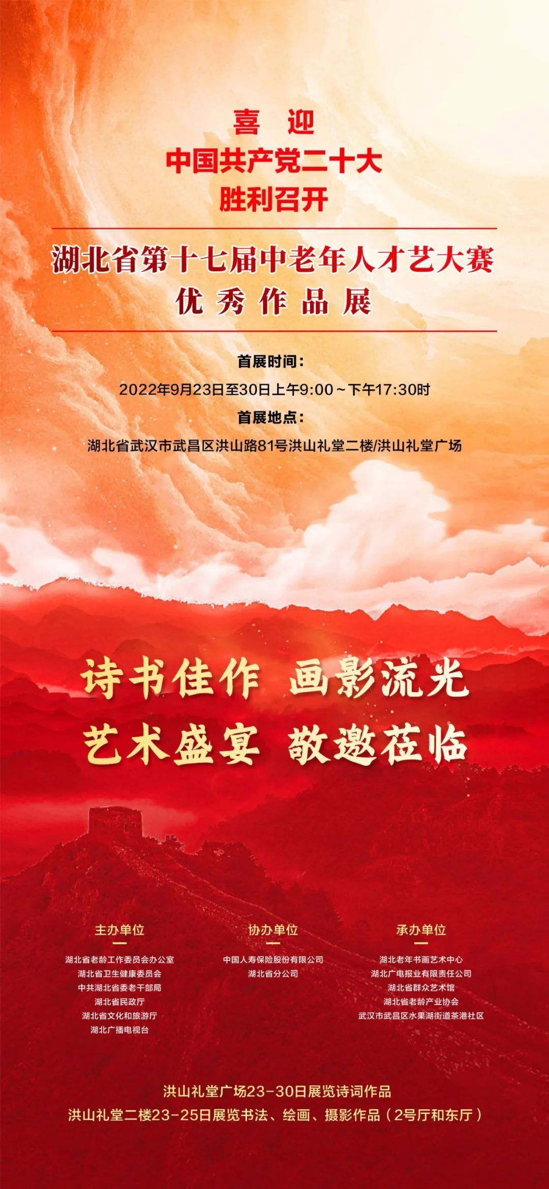 湖北省第十七届中老年人才艺大赛优秀作品展首展,定于2022年9月23日至30日,在洪山礼堂和洪山礼堂广场举办。展出100首诗词、100幅书法、100件绘画、100张摄影获奖作品和38件特邀作品,用我省中老年人优秀的诗书画影佳作喜迎中国共产党二十大胜利召开!诚挚邀请您莅临观展!