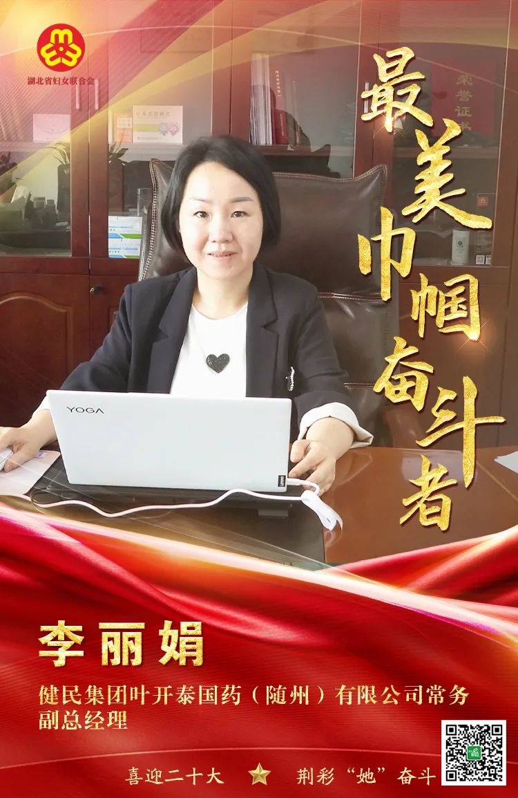 李丽娟,女,汉族,1981年12月出生,湖北随州人,湖北中医药大学本科毕业,高级工程师,现任公司党委委员、常务副总经理。十八年来,她勤勉敬业,敢于担当,锐意创新,使国药老字号“叶开泰”从濒临倒闭到实现年产销5亿元、利税5000万元的蜕变。近三年她带领公司累计实现销售收入14.5亿元,上交税收1.13亿元,实现利润0.87亿元,展现了一名共产党员产业报国情怀。公司被评为“湖北省高新技术企业”、“湖北省守合同重信用企业”、“湖北省职工职业道德先进单位”、“随州市突出贡献企业”,本人当选市政协委员,荣获区优秀共产党员等荣誉。