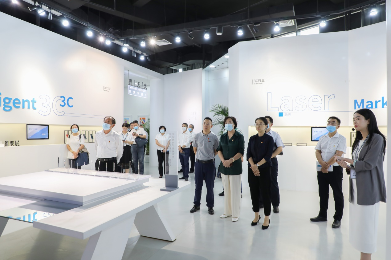 在华工科技智能制造产业园,童静菊一行走进激光科技馆和激光高端装备车间,了解中国激光产业的发展历程以及激光技术在3C消费电子行业、医疗、文化等多个领域的广泛应用,察看激光技术产业最新的应用展品,近距离感受高新技术发展赋能经济社会高质量发展的独特魅力。