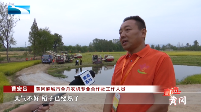 麻城市金舟农机专业合作社工作人员 曹宏吕:“天气不好,稻子已经熟了,再不收割,就全部趴下了。9台收割机,这135亩我们两个小时给它搞(收割)完。”