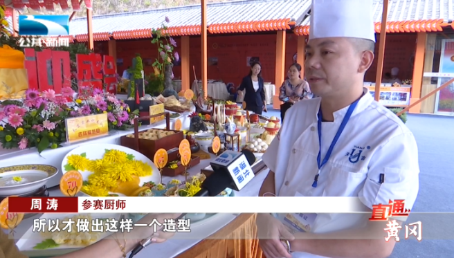 参赛厨师 周涛:“这次参赛的作品,我们有好几道关于菊花的系列。有金丝黄菊做脆炸的手法,还有一种用菊花做成菊花饼,这个菊花瓣它的特质,很容易破损、容易变黑,所以经过我们的反复研究,所以才做出这样一个造型。”