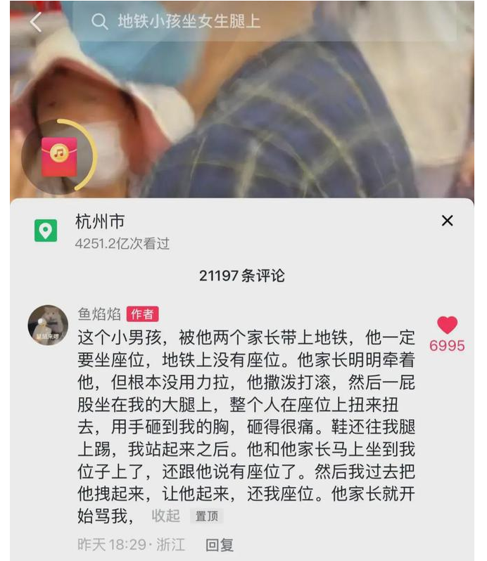 9月24日,浙江杭州一男孩地铁闹着抢座,一屁股坐女乘客腿上撒泼,“小孩子坐坐还不行啊”。事后女子回应:不是跟小孩计较,气的是家长没有及时制止孩子不当行为。