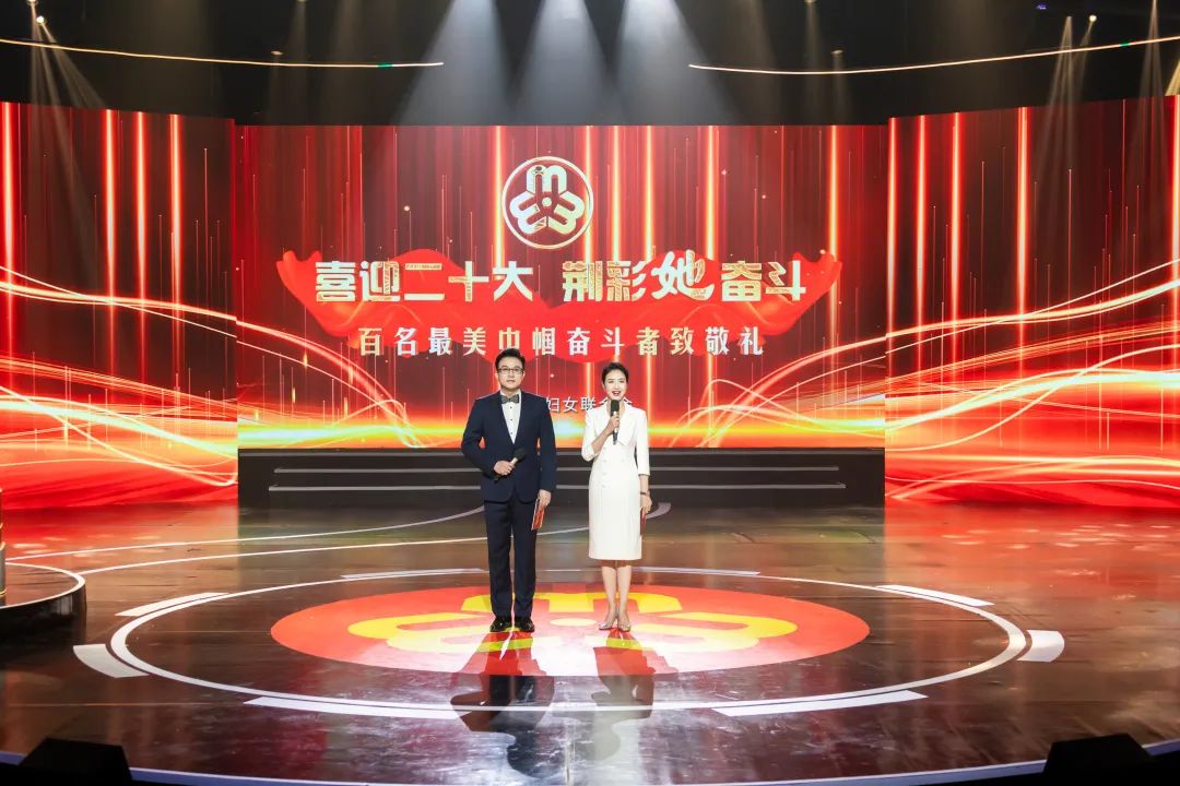 会场主屏幕格外醒目:流光溢彩的“喜迎二十大,精彩‘她’奋斗”几个大字在飘动的红彩带映衬下格外夺目,营造出激昂奋进、热烈喜庆的气氛。