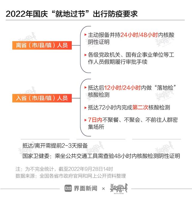 从各省市国庆“就地过节”政策来看,目前各地的防疫政策坚持“落地检”“三天两检”,实行报备制度。部分省市要求有省外旅居史的人员抵达12个小时以内,需在当地做第一次核酸检测。
