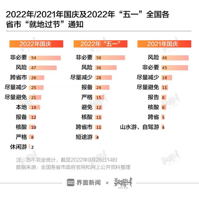 近一年以来,官方倡导的出游方式和出游距离稍有变化。在2021年国庆,各地发布的有关“就地过节”的通知里,“山水游”“自驾游”是被提及最多的出游方式。今年“五一”,官方对距离做出了进一步限制,更倡导“短途游”,在用词程度上,也选择了“避免”这类较为严格的词语。今年国庆节,“本地游”“休闲游”被提及较多,官方未对出行距离做出更严格的限制。