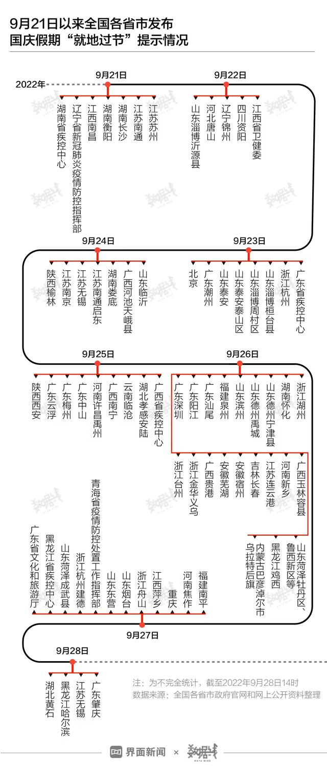 从时间上来看,自9月21日以来,各地疾控中心和卫健委等部门,开始密集发布国庆假期“就地过节”倡导和假期防疫注意事项。截至9月28日,至少有73地发布了相关通知,仅26日一天就有21地。
