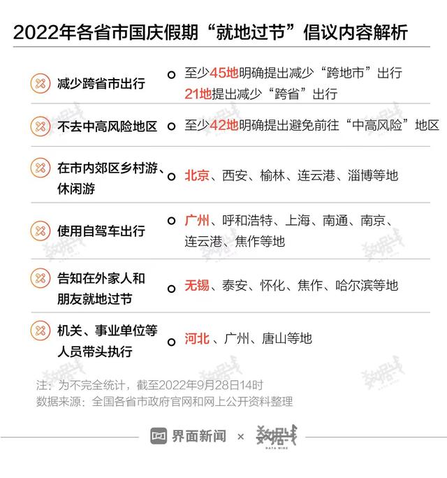 具体来看,今年国庆节各地“就地过节”政策依旧包括“减少跨省市出行”“不去中高风险地区”等,不少省市还倡导市民采用短程游、市内游、周边游等出游方式。
