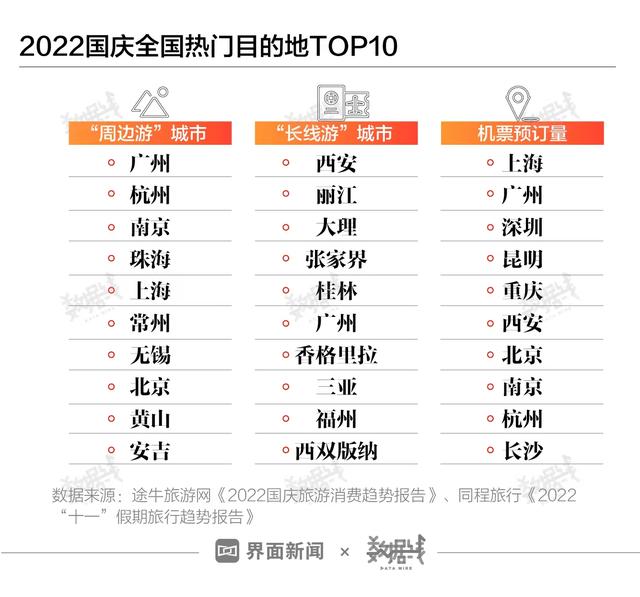 从数据来看,今年国庆节人们更倾向于“周边游”,广州、杭州成为热门城市。在“长线游”中,云南省有4个城市上榜,尽管当地存在零星疫情,仍不挡游客出游热情。此外,上海、广州、深圳、北京四大一线城市成为机票预订排名前十的目的地。