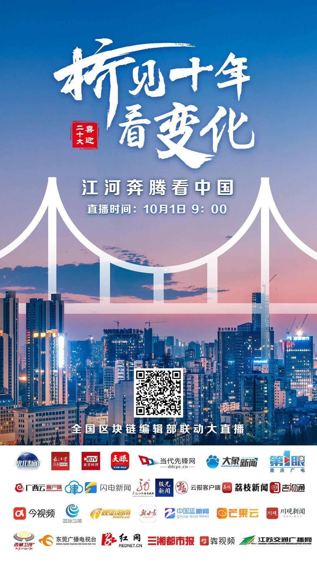 2022年10月1日,湖北广电融媒体新闻中心联动全国区块链编辑部,推出《江河奔腾看中国 “桥”见十年看变化》大型直播。湖北、重庆、河南、江苏、甘肃等地主播带你云游大江大河,领略中国桥梁的无限魅力,见证中国时代变迁。