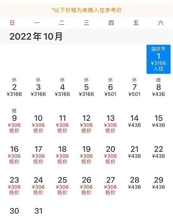 “价格实在太离谱了”,赵媛媛看到民宿价格后不禁感叹。9月24号,赵媛媛打开订票软件订房时,发现平时价格为300多元/晚的大床房到国庆却涨到1880元,平时500多元/晚的“双卧套房”房型则涨价超六倍达3400多元,只有6号和7号的价格便宜些。赵媛媛只好赶紧花389元订了6号入住的大床房,而十一期间乌镇景区内临水民宿标间仅需不到150元。