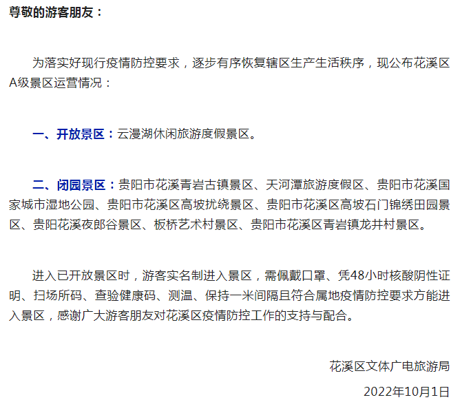 据“花溪文旅”微信公众号1日消息,花溪区A级景区开放景区:云漫湖休闲旅游度假景区;闭园景区:贵阳市花溪青岩古镇景区、天河潭旅游度假区、贵阳市花溪国家城市湿地公园、贵阳市花溪区高坡扰绕景区、贵阳市花溪区高坡石门锦绣田园景区、贵阳花溪夜郎谷景区、板桥艺术村景区、贵阳市花溪区青岩镇龙井村景区。