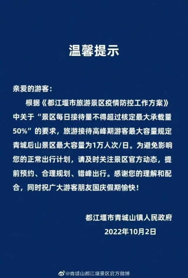 10月2日晚,@青城山都江堰景区 发布微博:根据《都江堰市旅游景区疫情防控工作方案》中关于“景区每日接待量不得超过核定最大承载量50%”的要求,旅游接待高峰期游客最大容量规定青城后山景区最大容量为1万人次/日。为避免影响您的正常出行计划,请及时关注景区官方动态,提前预约、合理规划、错峰出行。