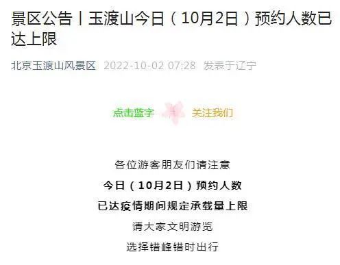 据北京玉渡山风景区官微2日消息,玉渡山风景区按照单日最大承载量的75%进行限流开放。10月2日预约人数已达疫情期间规定承载量上限。
