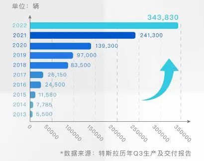 值得一提的是,根据特斯拉历年第三季度生产及交付报告数据,自2013年至2022年,十年以来,第三季度交付量增长了超62倍。