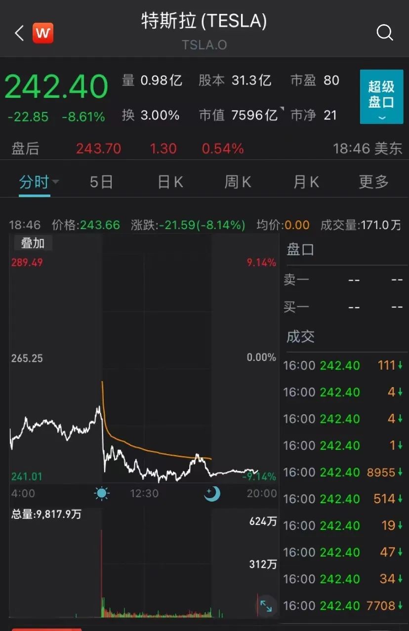 受此影响,当地时间10月3日,特斯拉股价直线跳水。截至收盘特斯拉股价报242.40美元,跌8.61%,总市值7596亿美元,蒸发了约715亿美元(约合人民币5080亿元)。