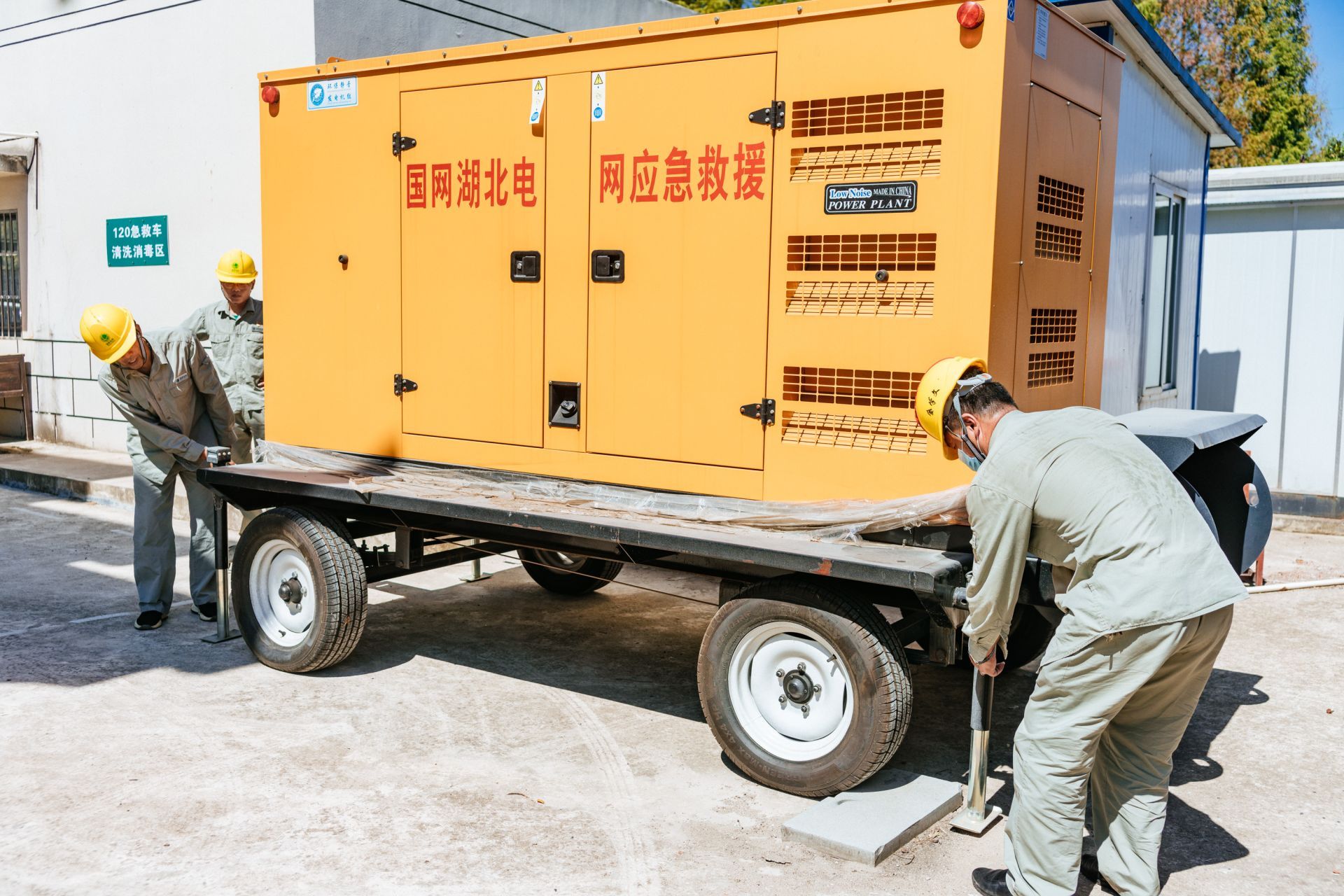 10月3日,在武汉经济技术开发区(汉南区)湘口街卫生院,一台拖车式150kW应急发电机定点就位,国网武汉市汉南区供电公司用电稽查班班长金学文和同事正在接线,保障辖区重点用户用电安全可靠。