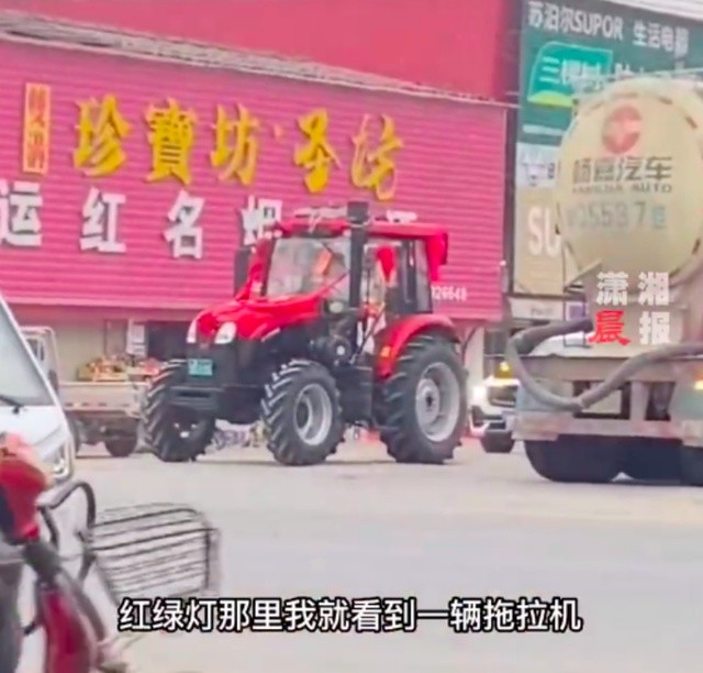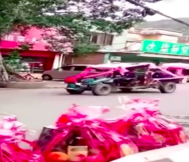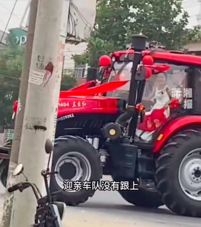 拍摄者表示,当天他正在吃早餐,在红绿灯看到一辆拖拉车行驶过来,结果仔细一看好像是辆婚车,里面坐着新郎和新娘。