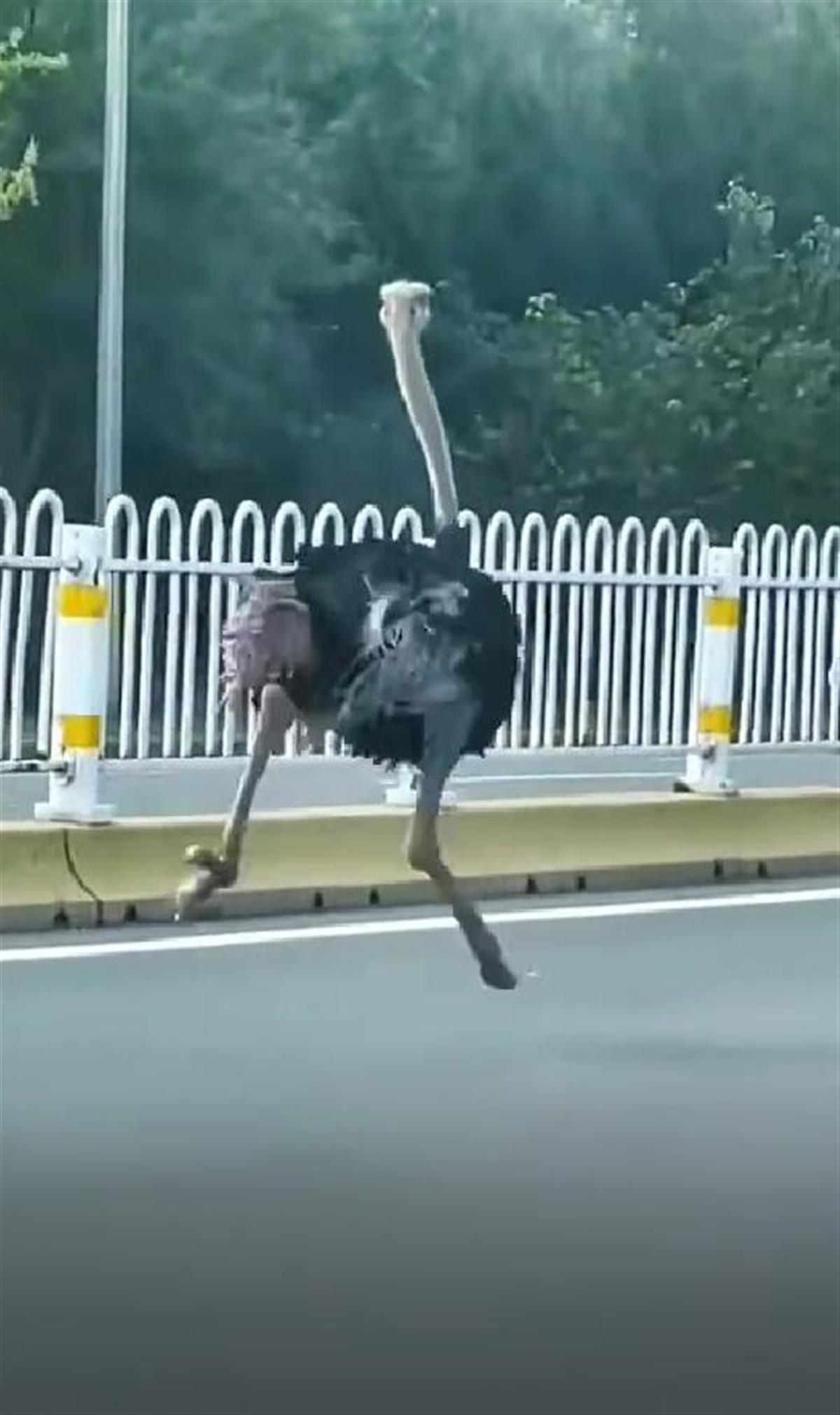 网传视频显示,在宽阔的马路上,多辆小汽车正在行驶中,突然出现一只鸵鸟在马路上奔跑。另一段视频显示,奔跑的鸵鸟和小汽车并驾齐驱,速度差不多。