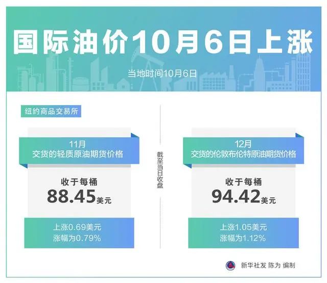 【国际油价消息】国际油价6日上涨。截至当天收盘,纽约商品交易所11月交货的轻质原油期货价格上涨0.69美元,收于每桶88.45美元,涨幅为0.79%;12月交货的伦敦布伦特原油期货价格上涨1.05美元,收于每桶94.42美元,涨幅为1.12%。