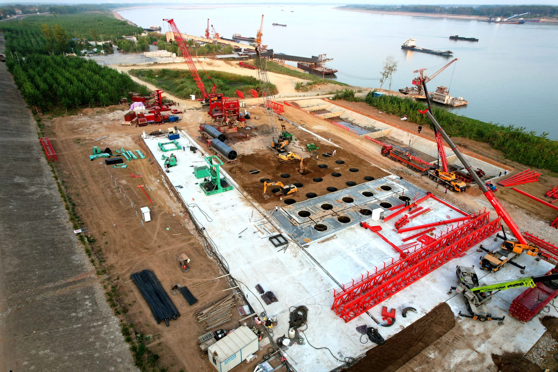 10月7日,在武汉市新洲区双柳街道挖沟村临江区域,近百名作业人员正忙碌在双柳长江大桥北岸施工现场,投入作业的门机、履带吊、回旋钻发出阵阵轰鸣。据现场指挥的中交二航局项目总工陈诚介绍,国庆期间,项目全体参建人员坚守一线,快速推进大桥建设,首根桩已钻进至平台以下100米。