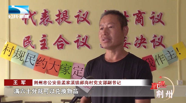 荆州市公安县孟家溪镇郝岗村党支部副书记 王军:“积极参与美丽乡村建设,环境整治等方面活动,一次记十分;还比如说邻里和睦、团结友爱的,一次记五分;热心帮助困难群众的、调解邻里纠纷的,一次记十分;满六十分就可以兑换物品。”