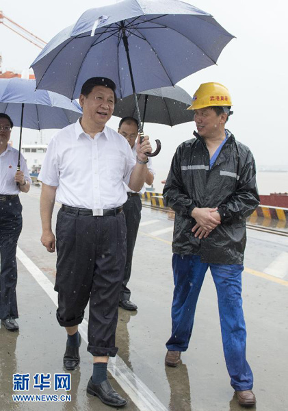 2013年7月21日上午,一场滂沱大雨不期而至,习近平总书记冒雨来到武汉阳逻港视察。撑着雨伞,卷起裤腿,这张雨中调研的照片刷屏了。这是党的十八以来,习近平总书记首次考察湖北的第一站。