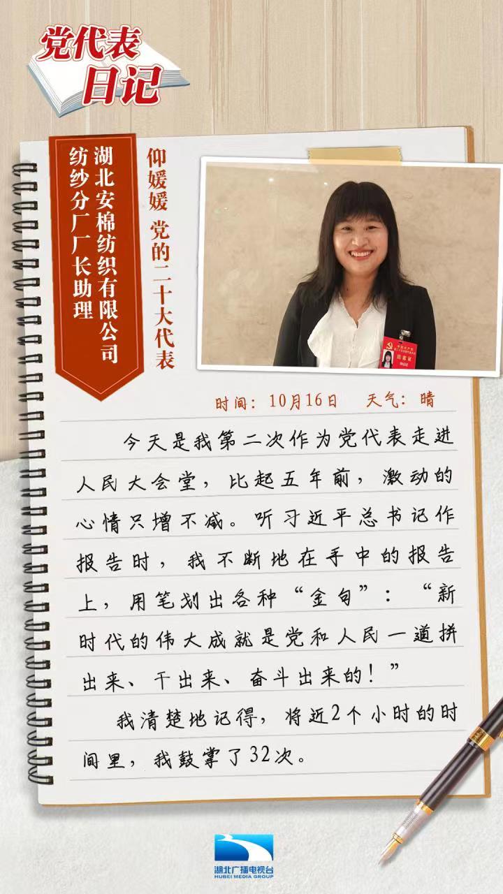 作为湖北安棉纺织有限公司一名纺织女工,这么平凡的我,居然连续两届当选党代表,从工厂车间走进人民大会堂,我感恩这个伟大的时代。这十年,我有幸见证了在党的带领下国家的飞速发展、湖北的飞速发展、企业的飞速发展。