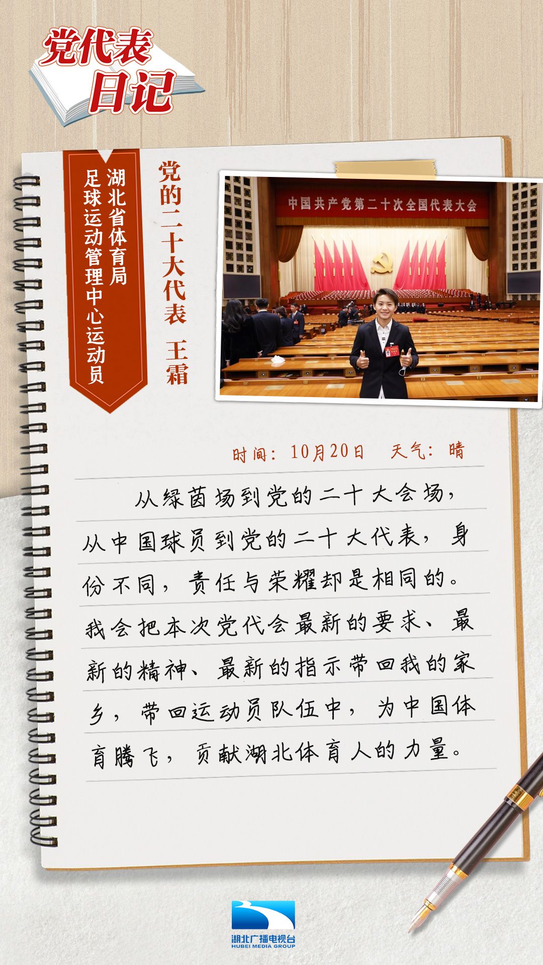 从绿茵场到党的二十大会场,从中国球员到党的二十大代表,身份不同,其中的责任与荣耀却是相同的。能代表湖北400多万党员到北京参加党的二十大,我感到责任重大,使命光荣。
