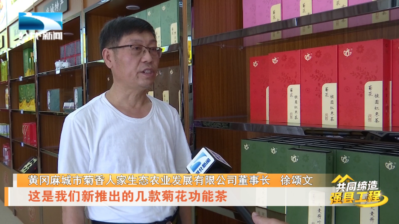 黄冈麻城市菊香人家生态农业发展有限公司董事长 徐颂文:“这是我们新推出的几款菊花功能茶,采用的是黄金菊,它的功效介于野生菊花和福白菊之间。”