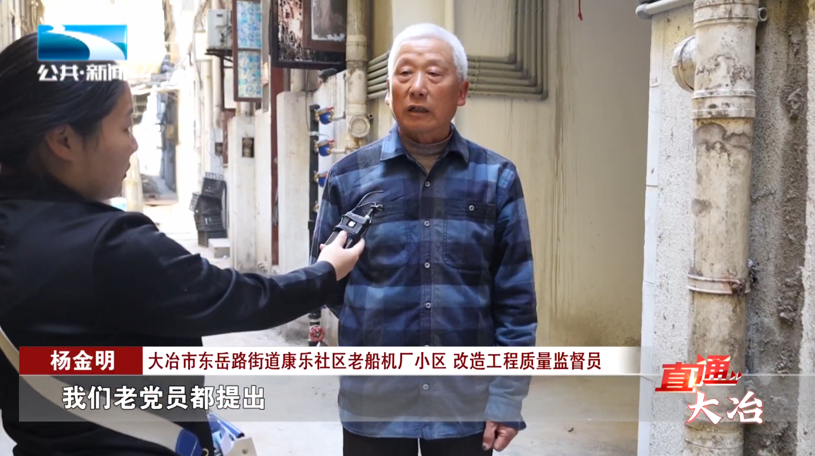 大冶市东岳路街道康乐社区老船机厂小区改造工程质量监督员 杨金明:“我们老党员都提出,水给它解决,以防漏水。”