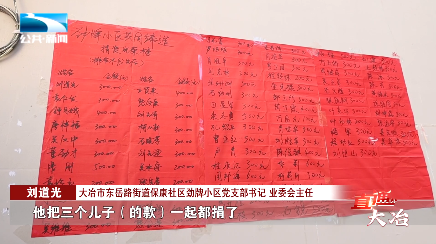 大冶市东岳路街道保康社区劲牌小区党支部书记、业委会主任 刘道光:“肖师傅91岁了,这次捐钱的时候 ,他不止一个人捐,他把三个儿子的款一起都捐了。”