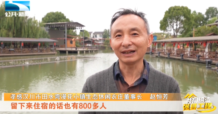 孝感汉川市田水湾漫花小镇生态休闲农庄董事长 赵恒芳:“田水湾(景区)在高峰期的时候人流非常旺,婚礼和游园的人大概有8000人左右,留下来住宿的话也有800多人,而我们田水湾目前的接待量只有100多人。”