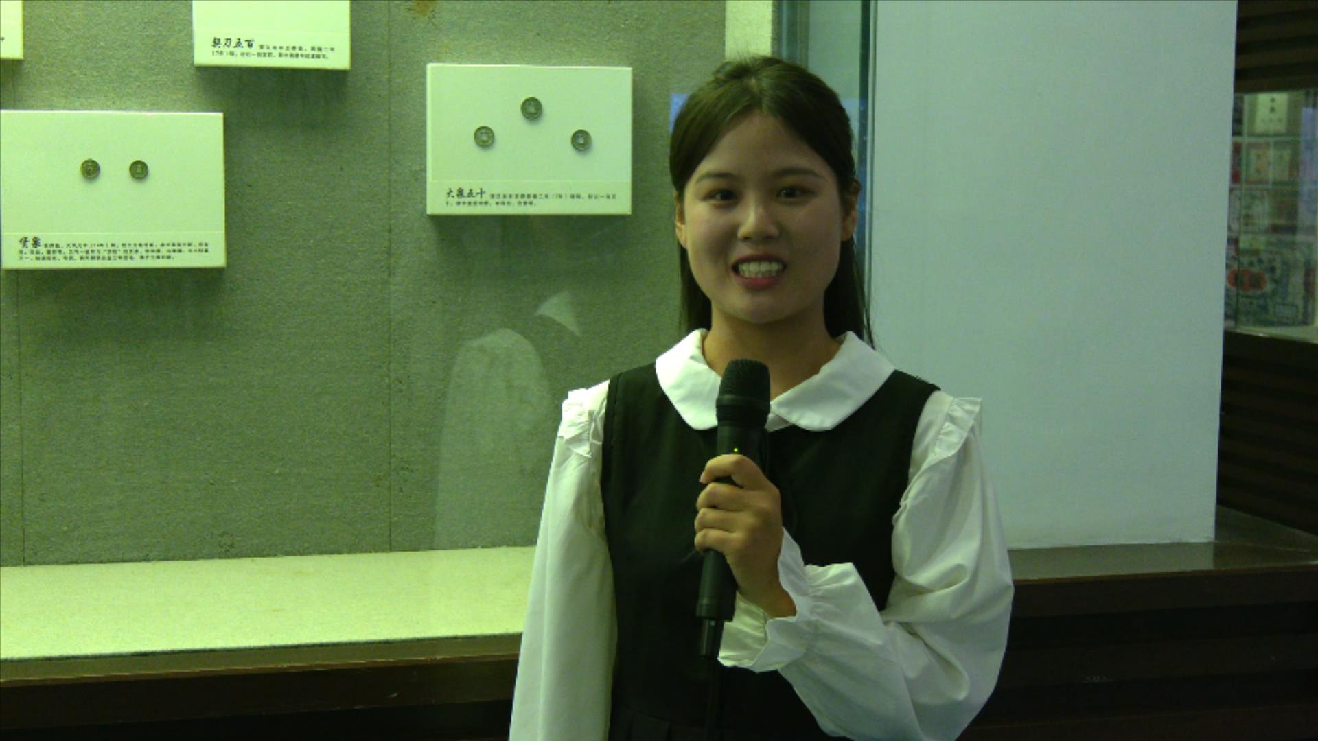 中南财经政法大学文物鉴赏与讲解协会志愿讲解员 张怡:我要给大家介绍一种钱币,叫做一刀平五千,它分为环柄和刀身两部分,环柄为方孔圆形钱,其上有黄金镶嵌的“一刀”两字,故也被称作为是“金错刀”,故事中有云:美人赠我金错刀,何以报之英琼瑶。为什么向大家介绍一刀平五千呢?因为它是王莽时期铸造的非常具有代表性的钱币,它的铸造十分精美,而且这也使得王莽获得了铸币高手的美誉。在明朝货币展区藏有该馆的镇馆之宝——泰昌通宝折五钱。其外形为圆形,中间有正方形孔,货币上铸有“泰昌通宝”四个字。