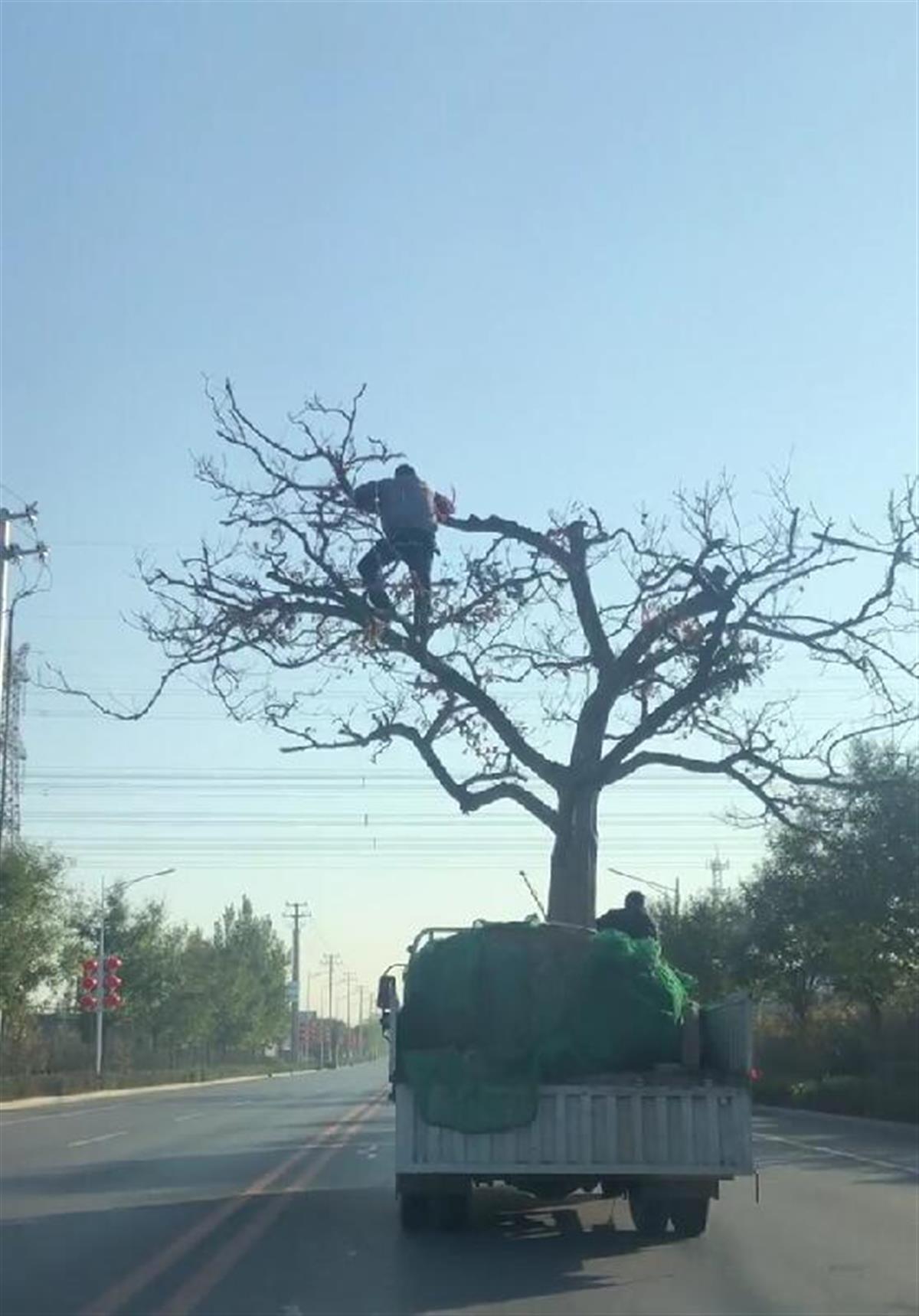 货车运一棵数米高的大树,然而随车运货的人,不在车上坐着,却爬到树上站在树枝上。11月15日,河北保定一名网友告诉记者,她14日看到了这惊险的一幕,当时为树上的人捏了一把汗。