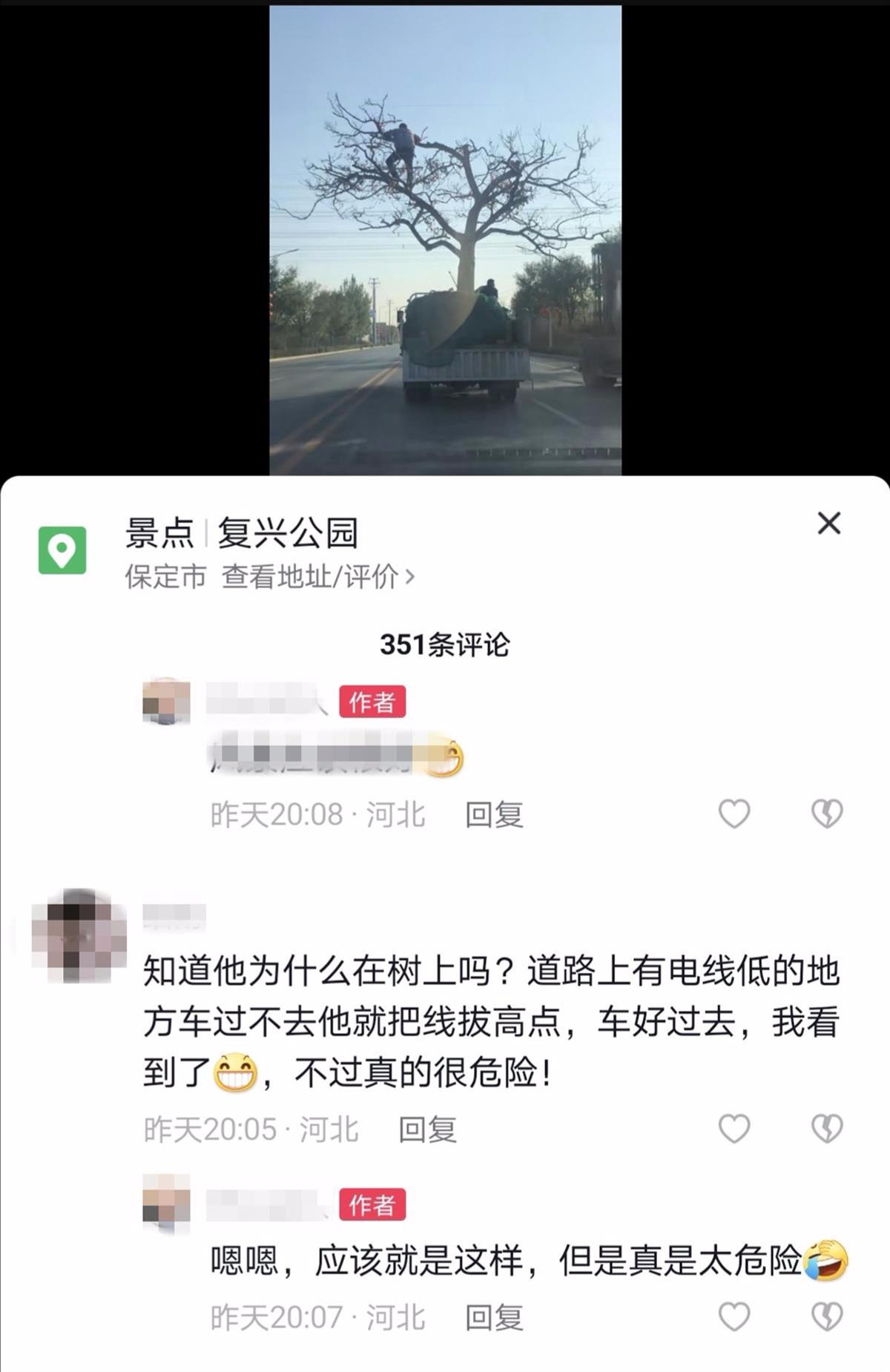 记者注意到,在视频的评论区,有多名河北保定网友表示也看到了这一场景。有两位网友分别称,路上有的地方电缆线比较低,看到站在树上的男子将电缆线撑高,让车通过。