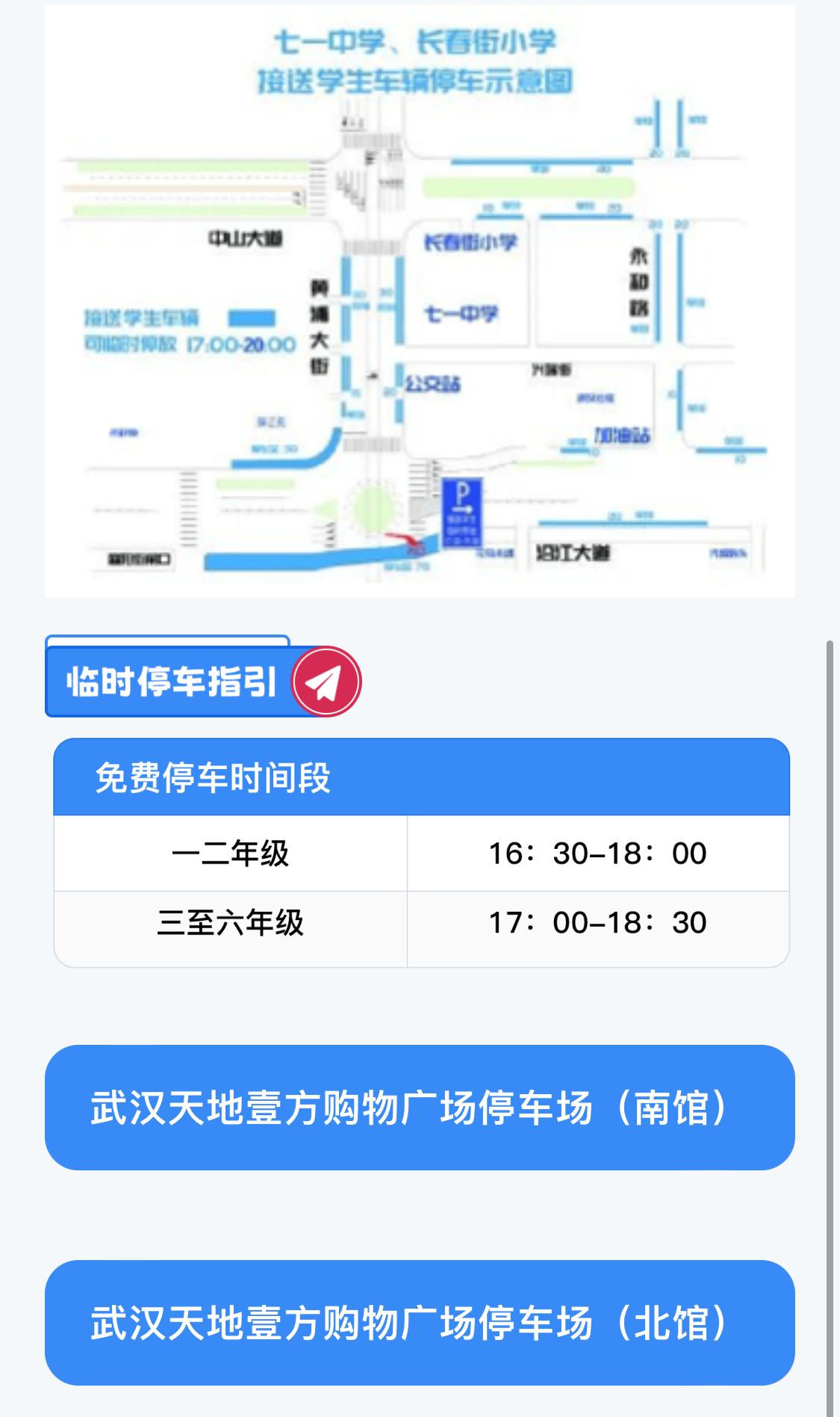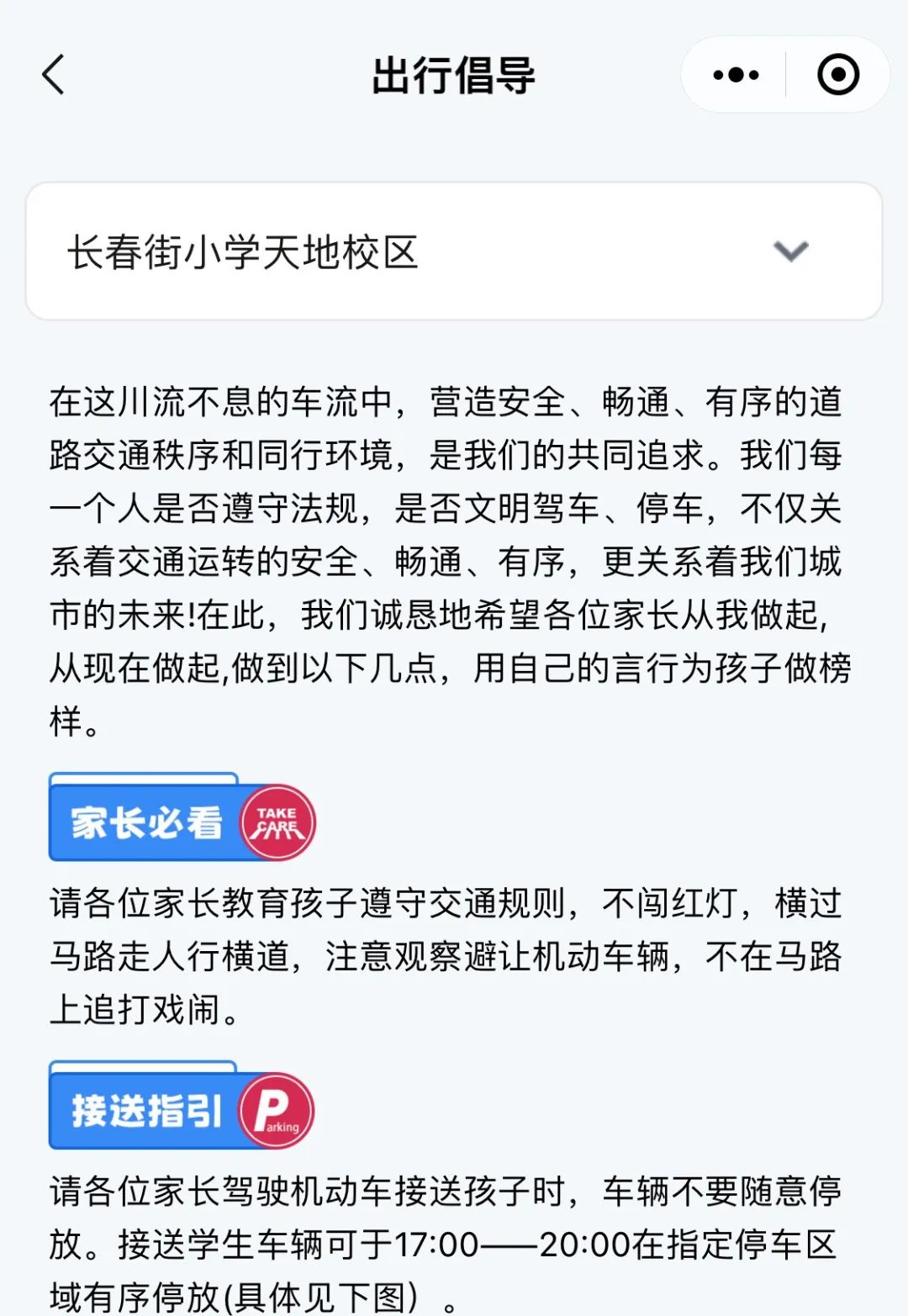 此外,小程序还有引导功能,实现上学放学出行有引导,接送更有序,试点学校接送、停车信息一键订阅,家长接送学出行更省心。