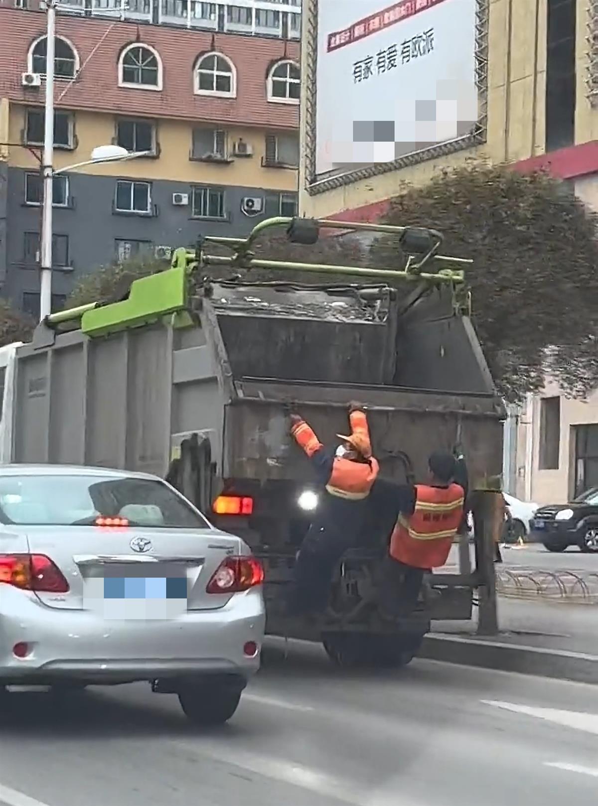 网传视频显示,一辆垃圾清运车正在行驶,两名环卫工双手紧拽着车厢尾部,挂在车上。当垃圾车遇到颠簸路面时,两人的身体也随着车摇摇晃晃。