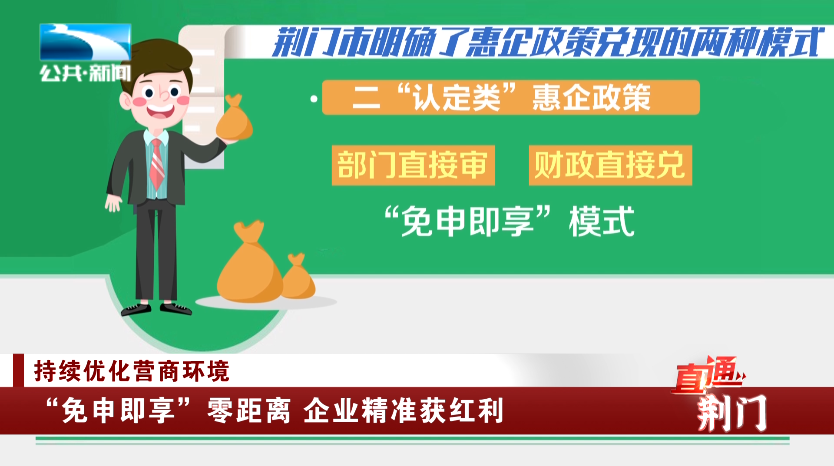 经过几年的探索,荆门市明确了惠企政策兑现的两种模式。一是对“申报类”惠企政策,实行“企业报、部门审、政府批、财政兑”的“即申即享”兑现模式。二是对“认定类”惠企政策实行“免申即享”兑现模式,改变过去“企业申报、部门审核、政府审批、财政兑现”的模式,简化为“部门直接审,财政直接兑”的“免申即享”模式,在程序上减少了企业申报,政府审批两个环节,在时间上由过去的12天压缩到现在的6个工作日。各县市区和政策主管部门将所需兑现的奖补资金,纳入部门预算中予以保障,确保“随到随兑”。