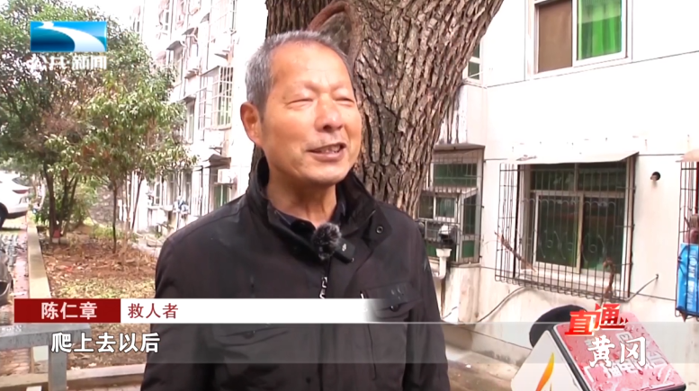 救人者 陈仁章:“爬上去以后,小孩哭狠了,我自己又慌,又急出汗来了,我就爬上去,把防盗网蹬几下就蹬开了,蹬开我才进去把小孩携着了。”
