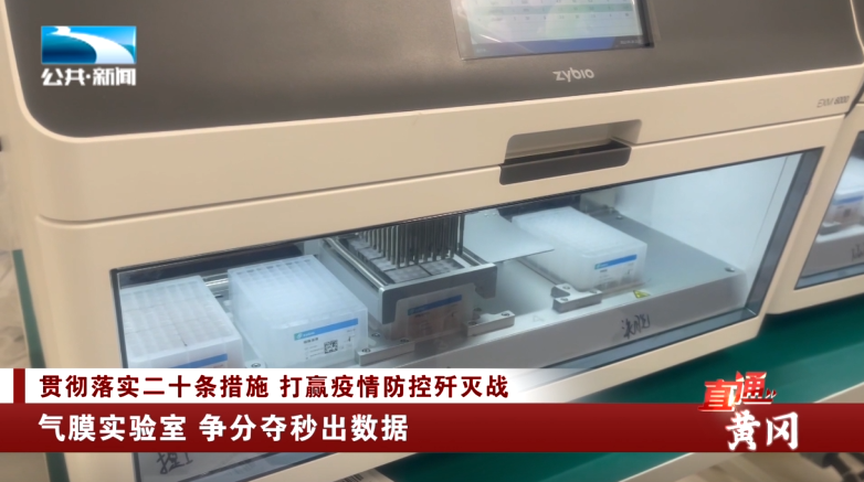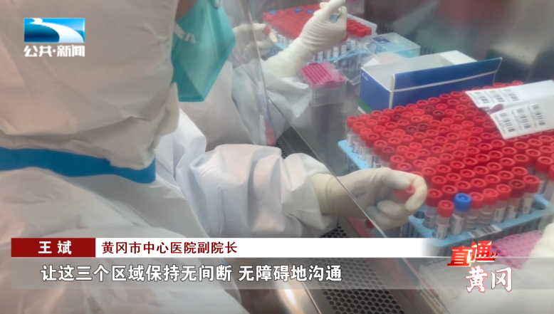 黄冈市中心医院副院长 王斌:“我们在信息化建设系统上面,对于三个(区域),一个加样区、一个转板区和一个扩增区这三个核心区域都放置了大屏显示和对讲系统,让这三个区域保持无间断无障碍地沟通,以提高我们的检测效率和检出的时间。”