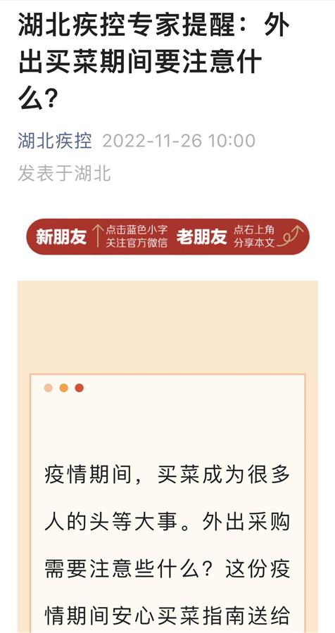 11月26日,湖北疾控官微发布提醒:疫情期间,买菜成为很多人的头等大事。外出采购需要注意些什么?这份疫情期间安心买菜指南送给您!