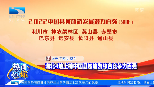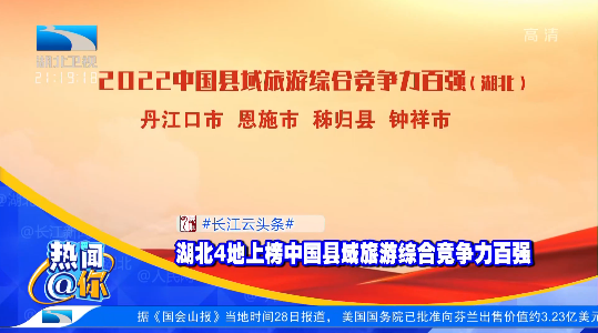 《中国县域旅游竞争力报告2022》发布,湖北丹江口市、恩施市、秭归县、钟祥市4个县市上榜综合竞争力百强,湖北利川市、神农架林区等8个县市上榜发展潜力百强。