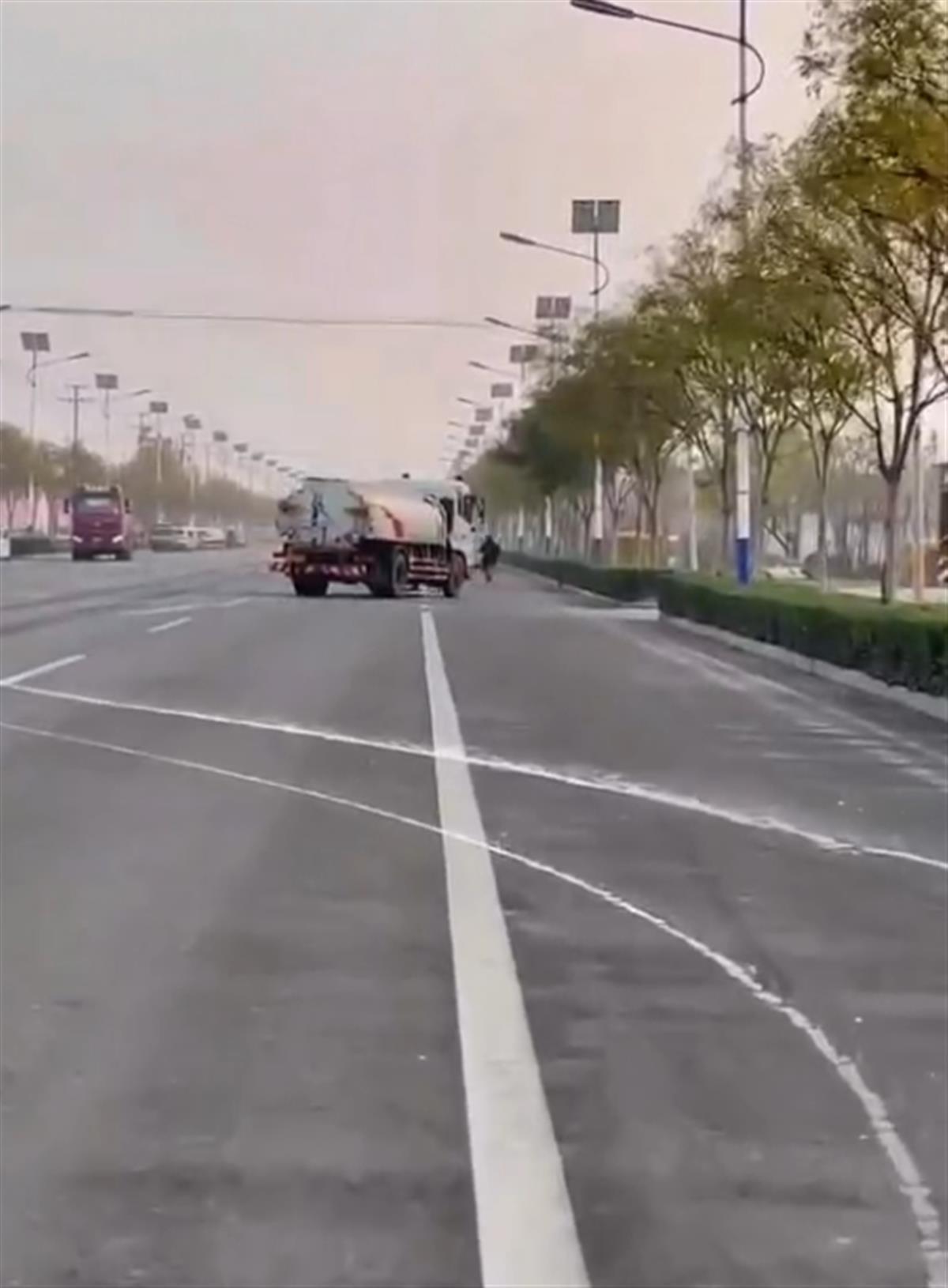 网传视频显示,一辆环卫洒水车在道路上走起了“S”线,路上不断有行人和车辆经过,情形危险。