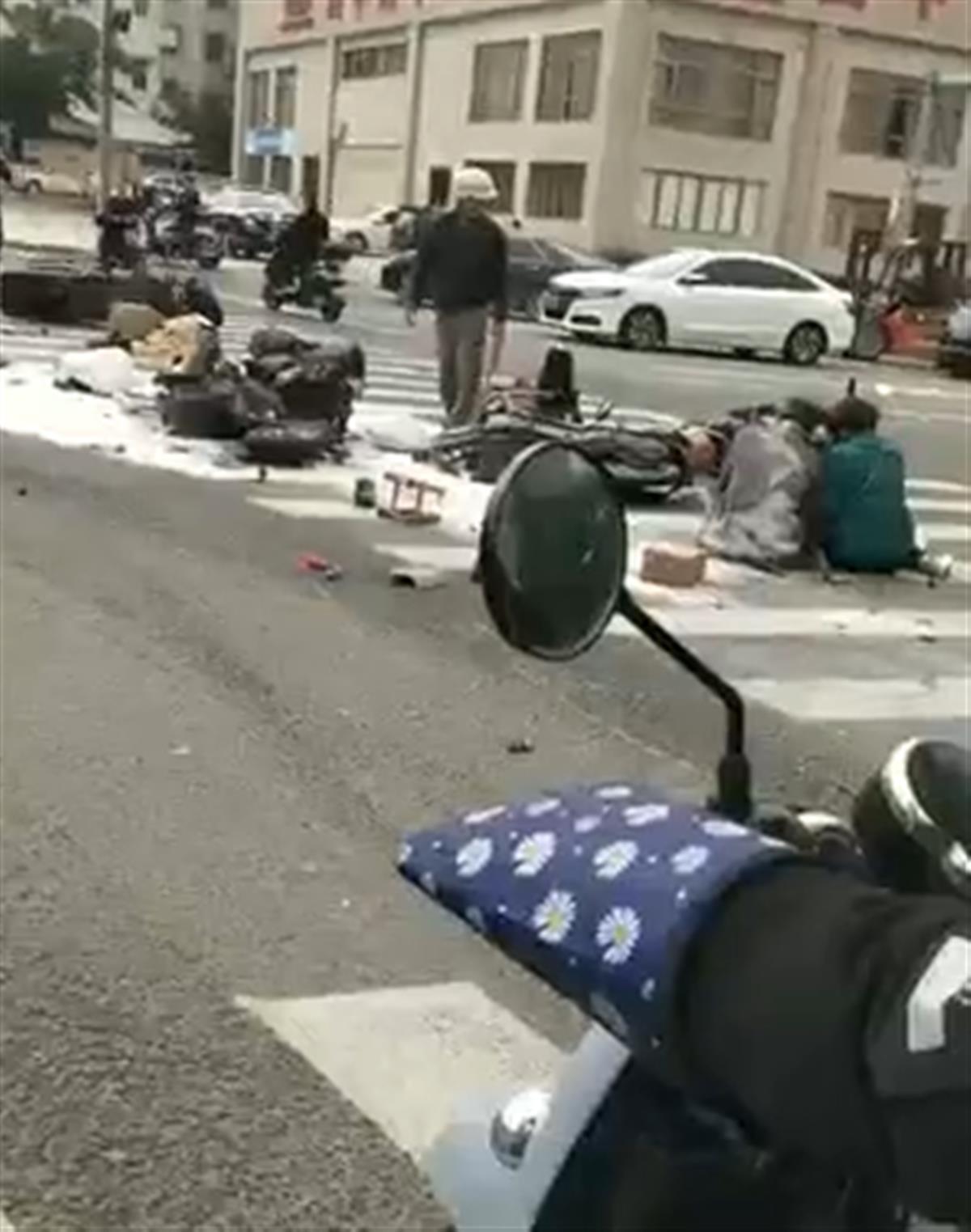 过路市民拍摄的现场视频显示,在一处红绿灯路口,一辆黑色轿车停在路边,车头损毁严重。不远处,几辆电动车倒地,路面上散落着纸箱和被撞坏的车子部件,其中一辆电动车的车轮被撞掉。事故现场,有两人被撞后坐在地上,还有一人趴在地上。
