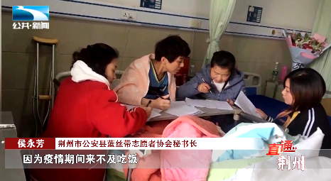 荆州市公安县蓝丝带志愿者协会秘书长 侯永芳:“当时她还是拴着钢板的腿,拖着腿连续奋战了几十天,因为疫情期间来不及吃饭,当时晕倒在草地上面了,后来才知道她又有了低血糖 。”