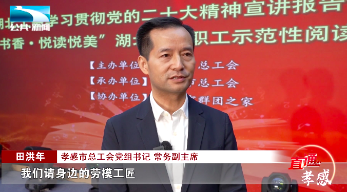 孝感市总工会党组书记、常务副主席 田洪年:“我们请身边的劳模、工匠,党的二十大代表和优秀女职工用自己的语言,以读书的方式来宣讲,其目的是想团结引领包括女职工在内的全市广大职工,听党话、跟党走,以劳动精神、劳模精神、工匠精神,书写新时代劳动新篇章。”