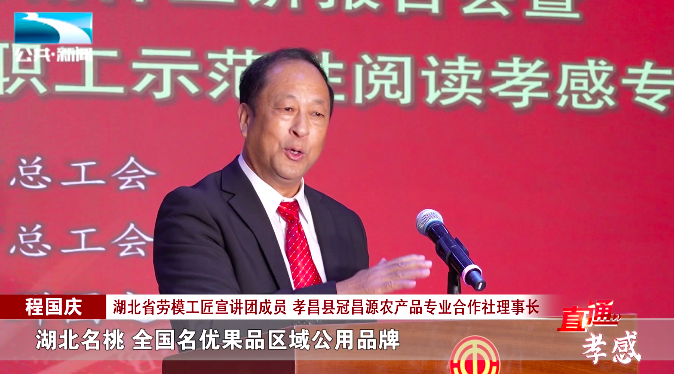湖北省劳模工匠宣讲团成员、孝昌县冠昌源农产品专业合作社理事长 程国庆:“将我们孝感的‘七仙红’桃打造成为湖北名桃,全国名优果品区域公用品牌,国家地理标志农产品品牌。”