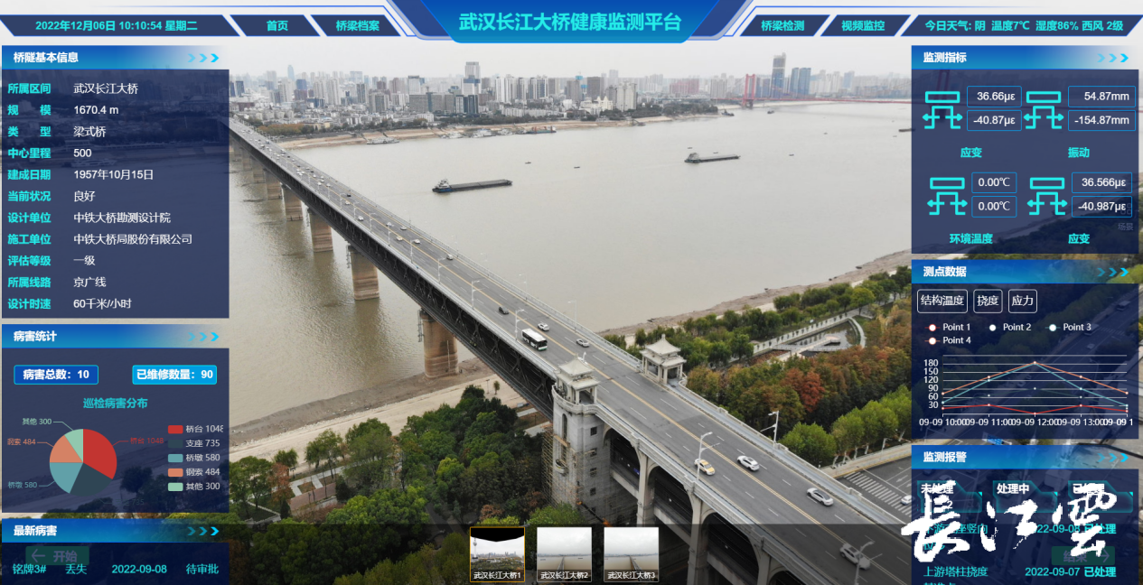 “武汉长江大桥全桥共布置114个传感器测点,监测参数主要包含环境温湿度、风速风向、结构温度、地震及船撞、主梁位移、支座位移、桥梁振动、列车信息监测等,涵盖了对桥梁结构监测及运营管养的必要因素。相关数据通过5G信号实时传输至武汉长江大桥健康监测系统管理平台,工作人员通过监控大屏或手机APP随时可以了解大桥实时的健康指数。”项目现场负责人中铁大桥科学研究院张朦朦介绍。
