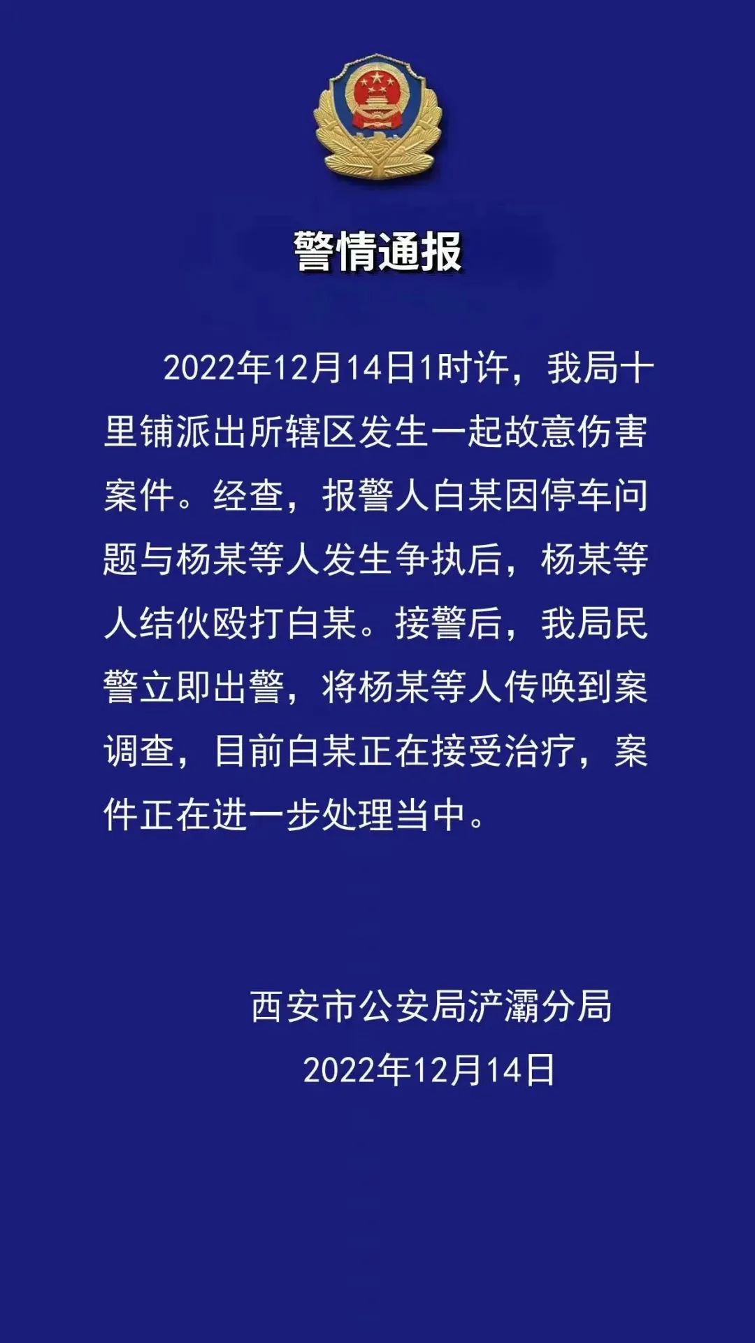 12月14日1时许,浐灞分局十里铺派出所辖区发生一起故意伤害案件。经查,报警人白某因停车问题与杨某等人发生争执后,杨某等人结伙殴打白某。接警后,我局民警立即出警,将杨某等人传唤到案调查,目前白某正在接受治疗,案件正在进一步处理当中。