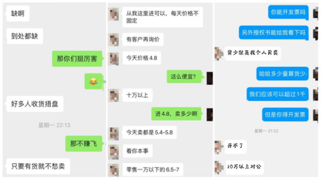 若感兴趣还可以成为他的“下线”,从陈博这进货,每日进价不固定,例如十万支起售的单子,进价为4.8元,售价在5.4元-5.8元;一万支起售的单子,售价在6.7元-7元,“卖多少价看你的本事”。